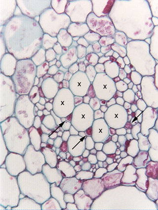 Transverse section of water lily petiole (Nymphaea). The large round, empty-looking cells marked by Xs are sieve tube members, similar to those shown in longitudinal section in Fig. 3.5-1. The small angular cells (three are indicated by arrows) that are almost filled with red contents are companion cells, which control the metabolism of the sieve tube members.